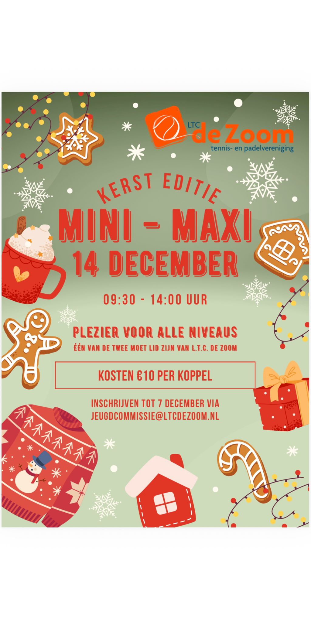Inschrijven kan t/m 7 december door te mailen naar: [email protected] met jullie namen en leeftijd. De kosten bedragen €10 per koppel. Trek gerust iets feestelijks of winters warms aan en kom samen genieten van een sportieve, sfeervolle ochtend in echte kerstsfeer!